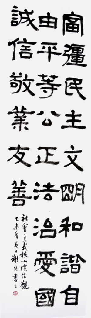 由民进江苏省委主办、江苏民进江海书画会承办的“盛世辉煌——庆祝民进成立70周年江苏民进书画精品展”日前在北京马叙伦纪念馆举行,我市书法家谢飞以社会主义核心价值观为主题的隶书条幅作品入展。
