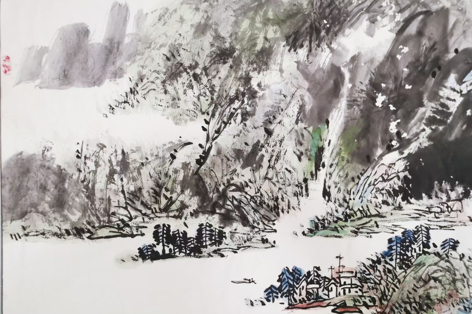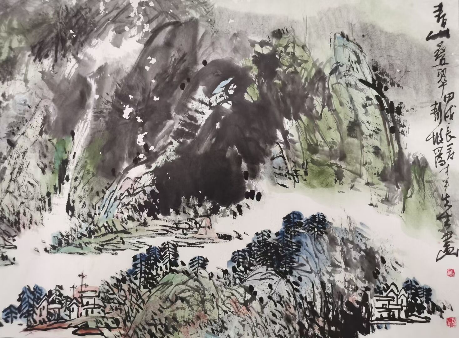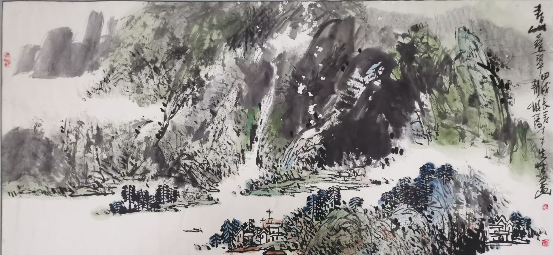 【吕凤子弟子、当代实力派书画家★莫静坡老师】山水画精品《青山叠翠》尺寸109✘51,原裱镜片,品相如图。