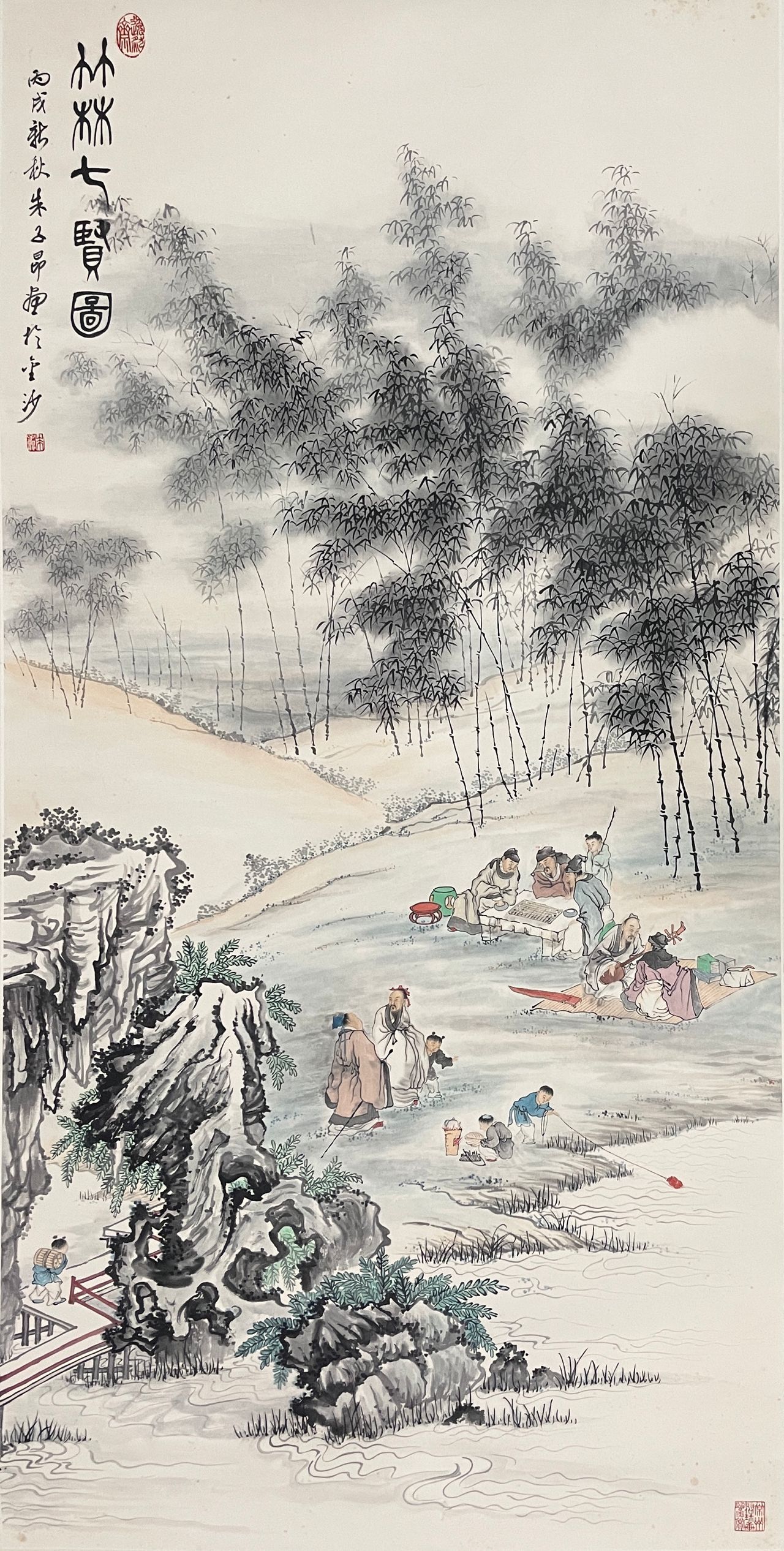 【当代著名人物画家★朱子昂先生】精品之作《竹林七贤》原裱立轴,四尺整张136×68,品相如图。