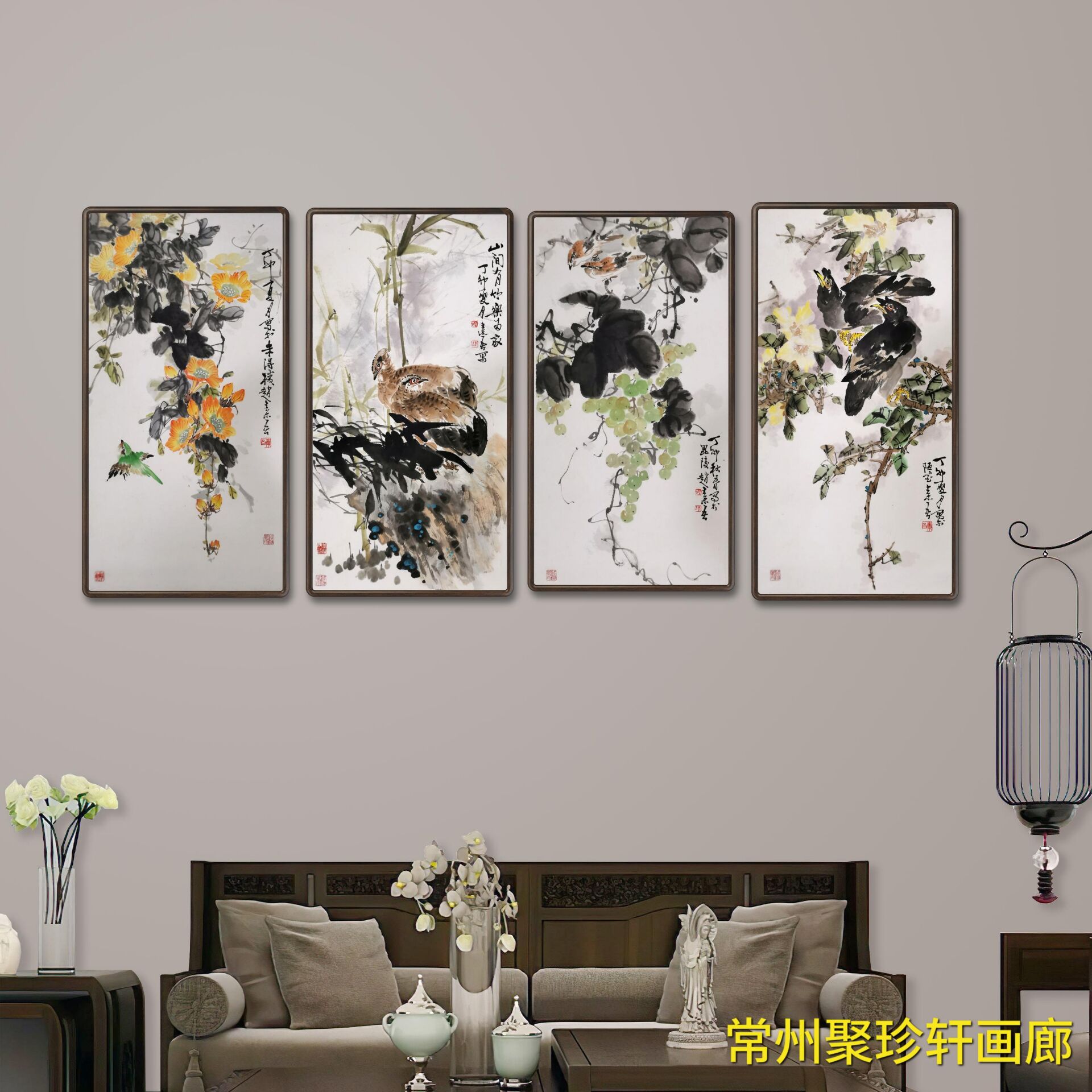 • 赵素吾《花鸟》四条屏精品,原裱镜...
